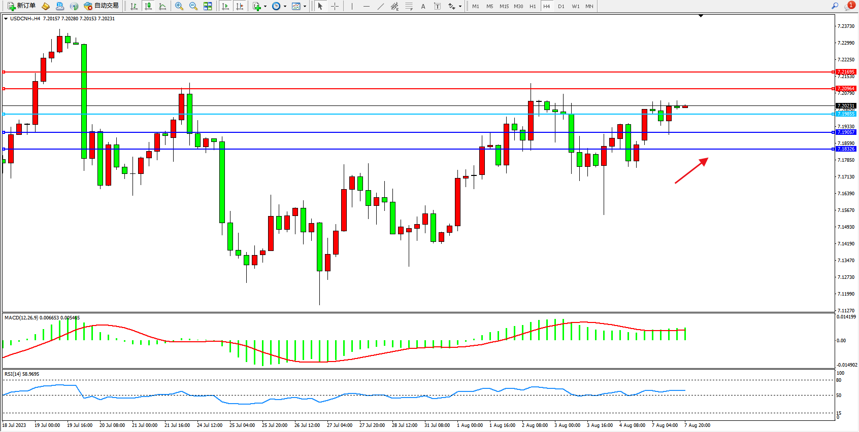 交易策略:7.19855上方看涨,目标7.20964  7.21695