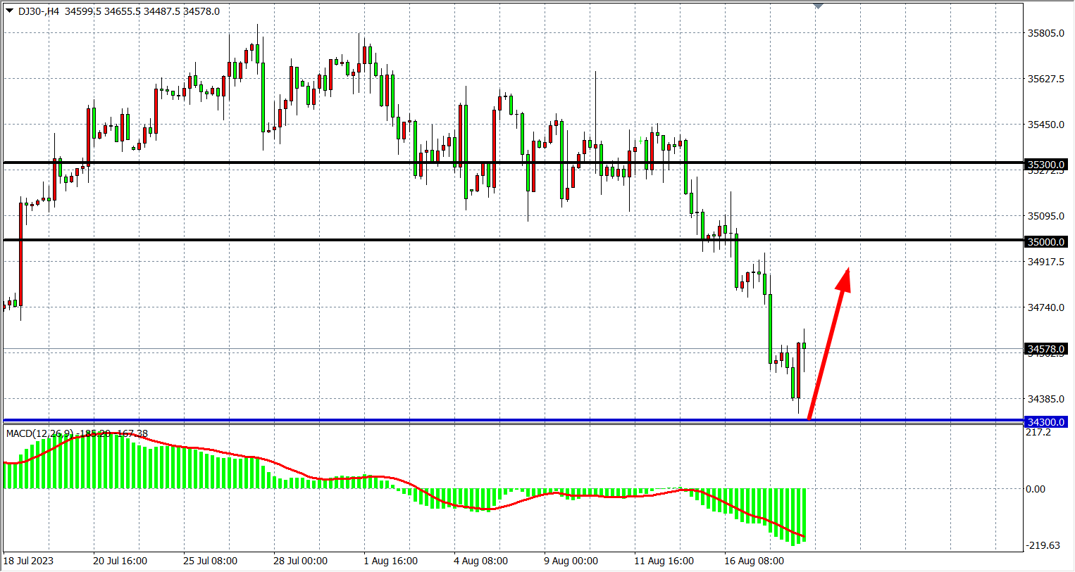 4小时图看,道指在34300一线获得支撑反弹,MACD在零轴下继续放量,行情出现短暂支撑,关注下方34300一线,阻力依旧关注34780-35000。