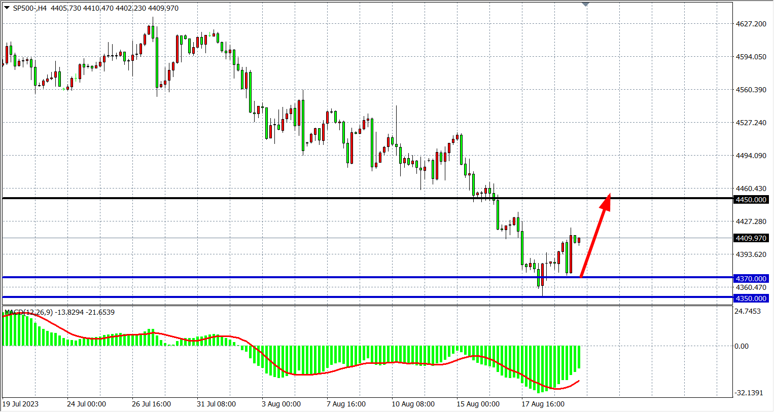4小时图看,标普跌至4350附近反弹明显,MACD量能在零轴下放量,行情走势仍较疲弱,阻力关注4450附近,支撑关注4350-4370。