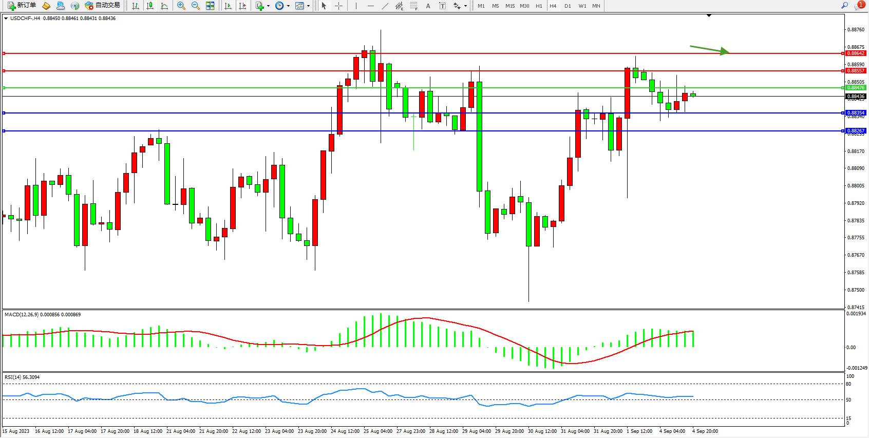备选策略:0.88476上方看涨,目标0.88557  0.88642