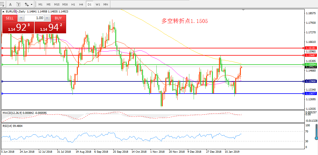 日线图看,欧元大幅上行,再次逼近200均线阻力,均线系统拐头向上平, MACD红柱增加,如能突破上方阻力,反弹概率较大。