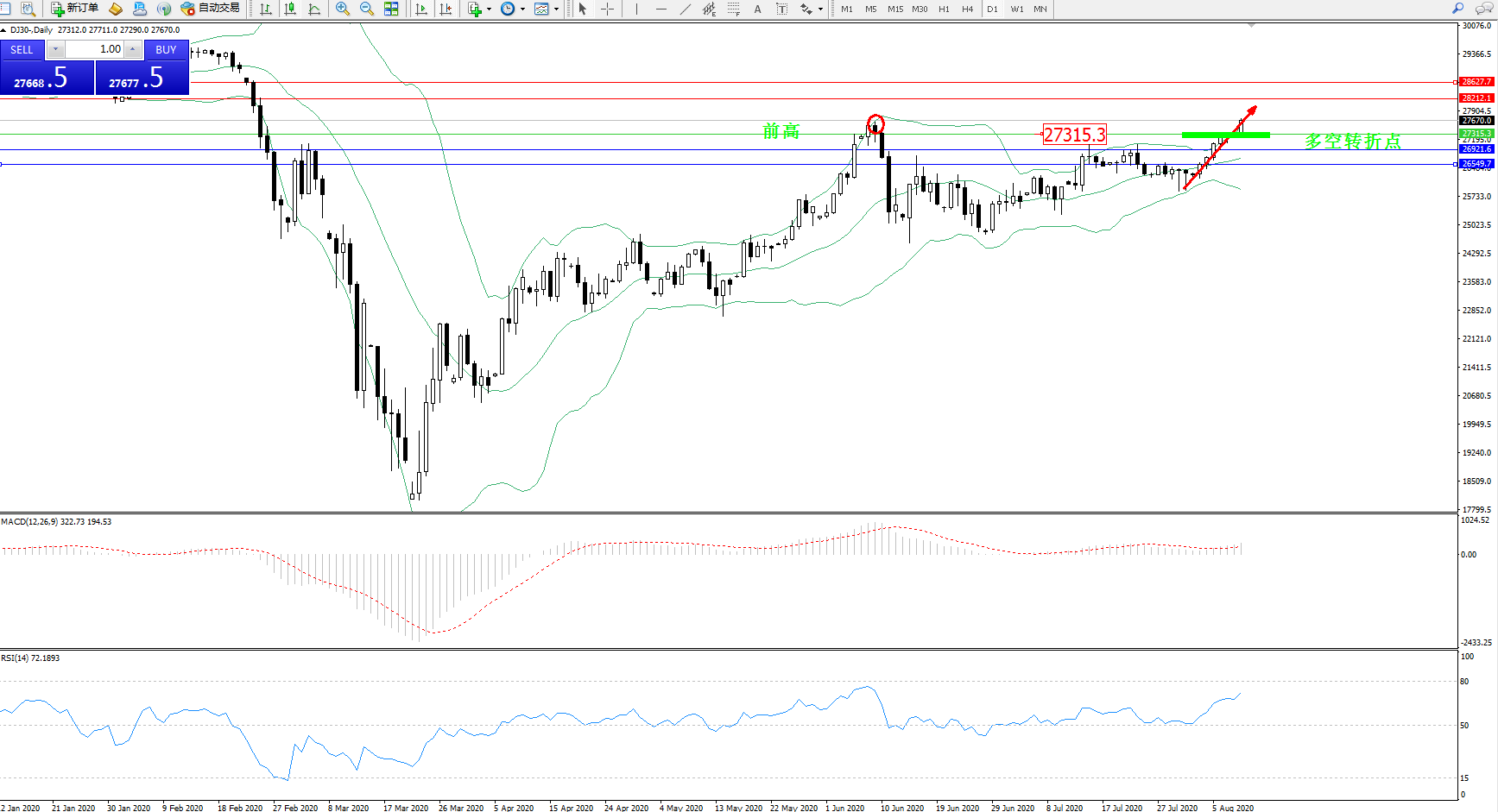 道琼斯指数8月10日(周一)收盘上涨358.00点,涨幅1.30%,报27791.44点。美股三大指数收盘涨跌不一,投资者抛售了近期一些高涨的股票。在最新一轮上涨行情中,美股接近重返历史高位,能源和工业板块领涨,芯片制造商领跌。科技股一直是这一年中为数不多的坚挺板块之一,如果你看到该板块出现了一些回调,仅仅因为它是弹性较强的行业之一。在特朗普绕开国会实施小范围纾困措施后,时隔两天至今没有迹象表明该策略将推动共和党和民主党人回到谈判桌前。美国财长姆努钦表示,双方可能在一揽子方案中的部分问题上做出妥协,有望达成“公平协议”,但是在周一接受采访时,他依然反对民主党坚持的将近1万亿美元用于援助州和地方政府的主张,称其为“荒谬之举”。