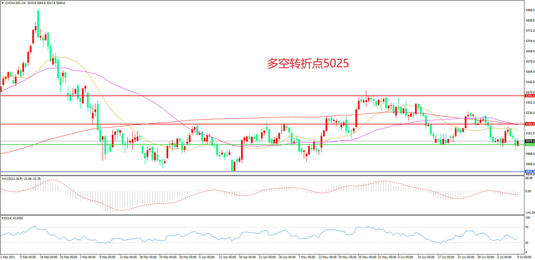 4小时图看,沪深300延续区间震荡形态,5025成为下方支撑,均线系统下压成为上方阻力,高点逐渐降低,MACD绿柱缩短,RSI指标走平,日内延续震荡概率较大。
