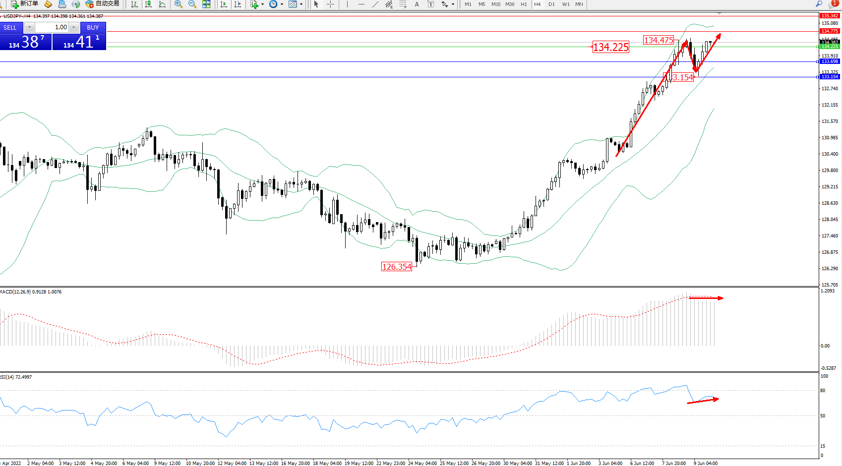 技术点评:多头动力延续布林带指标通道中上轨区间持续震荡上扬,高位抵达134.475附近节点后震荡,短期回撤后再度拉升,多头上扬态势良好,且上行趋势未见最终止步迹象,布林带指标呈上行趋势走势持续中,MACD指标处于多头区域维持整理平移,RSI指标处于超买区80均衡线下侧徘徊;