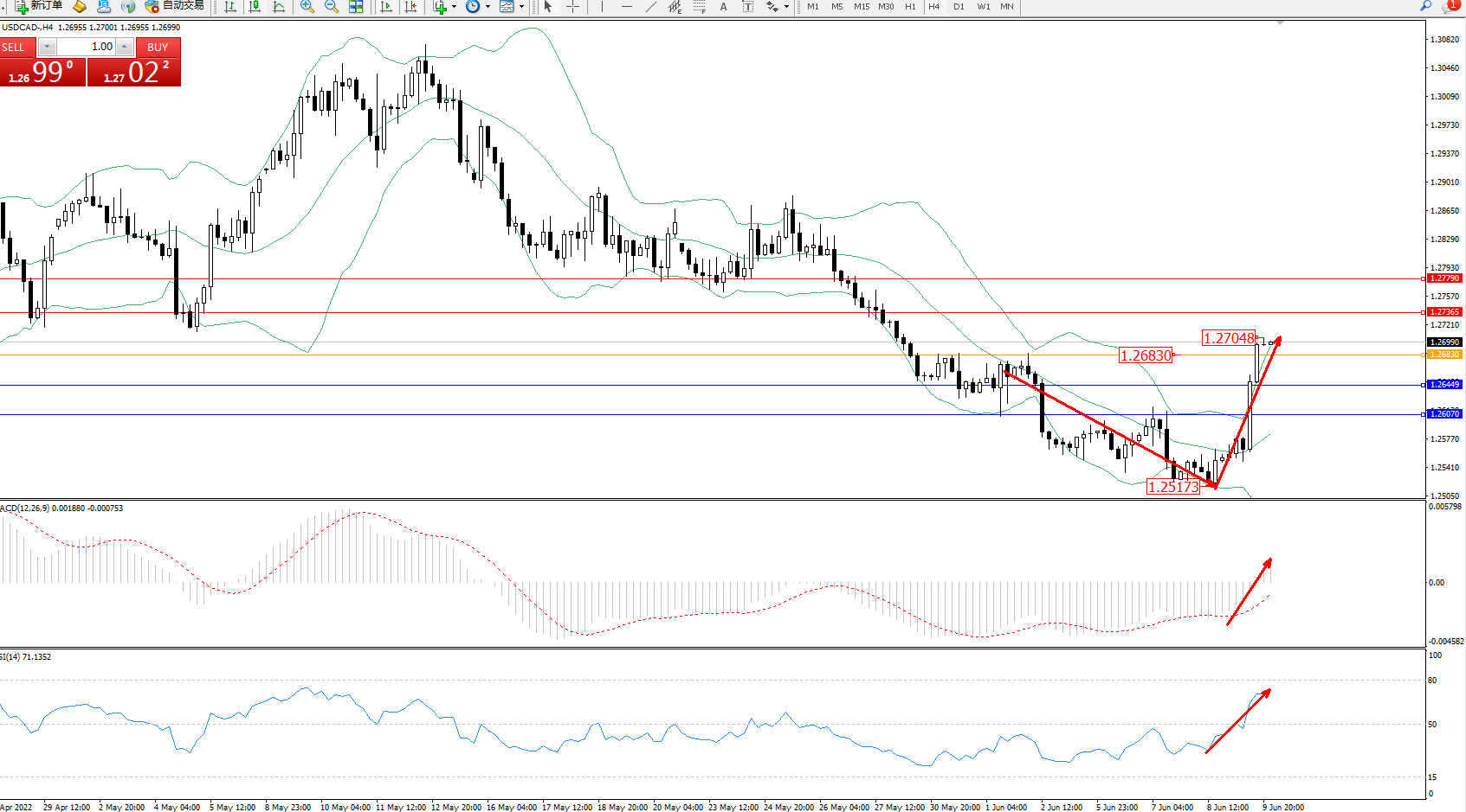 技术点评:长时间维持在布林带指标通道中下轨区间持续震荡下行,低位抵达1.25173附近节点后,多头动力伺机入场,强势拉升上扬,突破布林带指标上轨至1.27048附近节点后整理,短期多头动力有继续拉升态势,布林带指标呈张口走势态势良好,MACD指标处于0轴线上方不断上移,RSI指标处于50均衡线上側持续攀升;