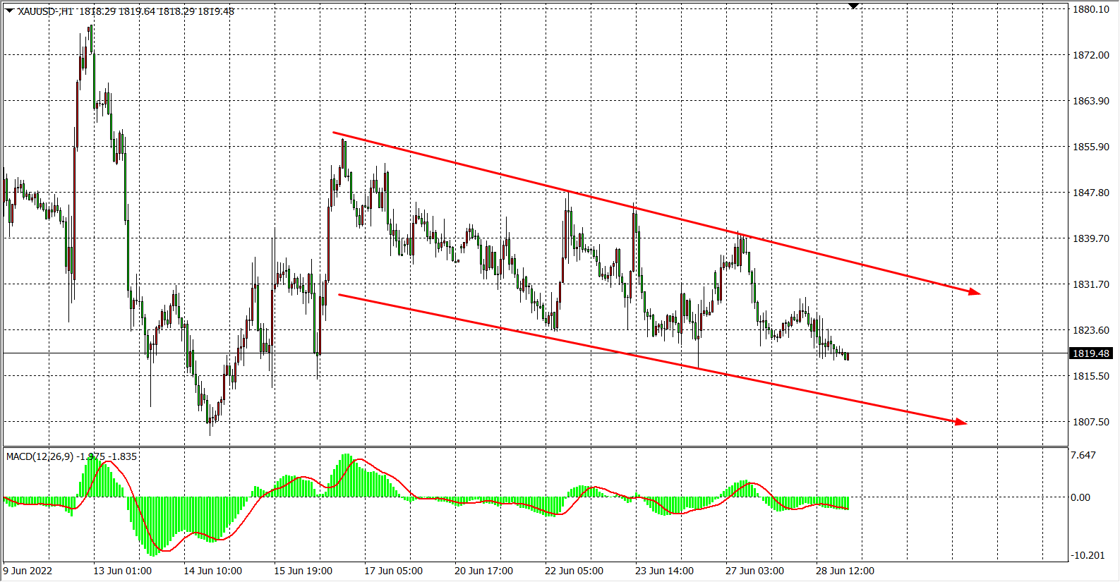 1小时图看,金价反弹1830后受阻回落,再度回探至1820关口盘整,呈下降趋势通道明显,同时MACD也在零轴之下开始放量,预期行情有进一步走低的可能。日内以1830作为多空分水线,在1830之下对趋势继续看空,目标看1810-1800附近。