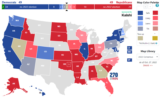 综合当下选民最为关心的议题讨论,市场预期民主党或至少会丢掉一院的掌控,后期拜登政府对政策推进更加步履维艰。若共和党掌控国会,无疑将为2024年的总统大选增加筹码。本次中期选举选情较往届表现将更为胶着,摇摆州的选举或起关键作用。