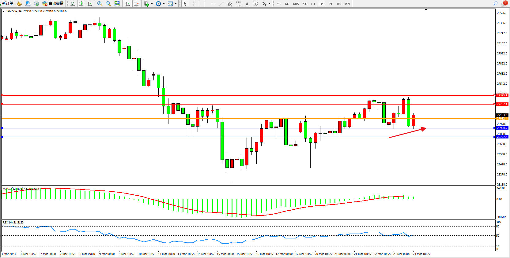 4小时图看:短期维持区间宽幅震荡,市场多头动力依旧,MACD指标处于0轴线上側徘徊,RSI指标处于50均衡线附近弱势徘徊;